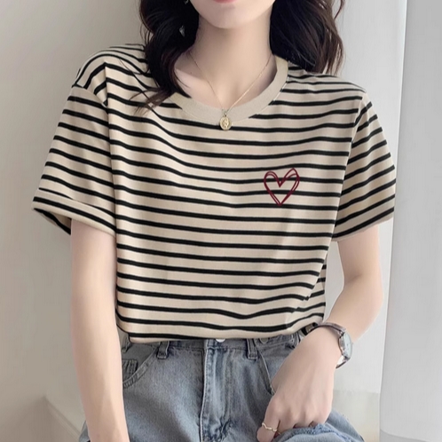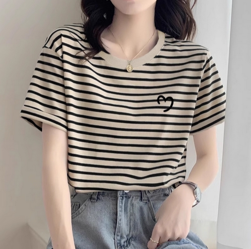 2025新款正肩条纹纯棉短袖t恤女时尚洋气宽松休闲上衣打底衫夏季